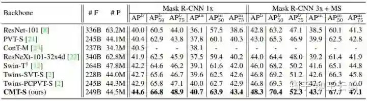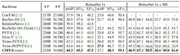 表4和表5分别展示了CMT-S在不同框架(如RetinaNet和Mask R-CNN)不同检测任务上的结果。在相似的计算量约束下,CMT-S相比其他的网络在性能上有大幅度的提升。