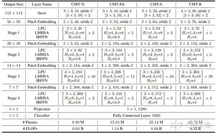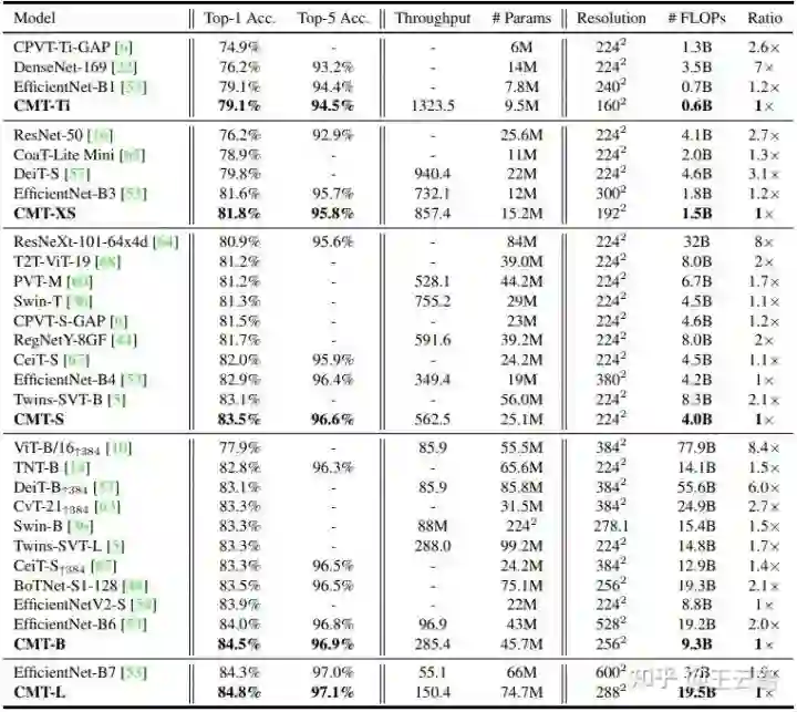 我们以CMT-Small为基础,利用上述放缩公式得到了相应的CMT-Ti,,CMT-XS和CMT-B。这些模型对应的ImageNet输入大小分别为160x160,192x192,224x224(CMT-S)和256x256。