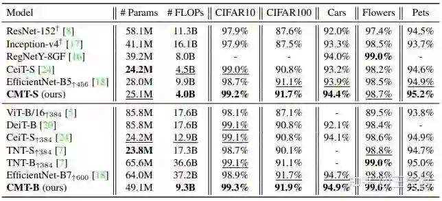 为了证明CMT具有很强的泛化能力,我们将在ImageNet上训练的CMT-S、CMT-B模型迁移到其他数据集。更具体地说,在5个图像分类数据集上评估CMT模型,包括CIFAR-10、CIFAR-100、Stanford Cars、Oxford 102 Flowers和Oxford IIIT Pets。所有模型微调的图像分辨率为224x224。表3比较了CMT与EfficientNet、DeiT、TNT等网络的迁移学习结果。