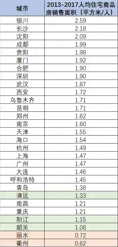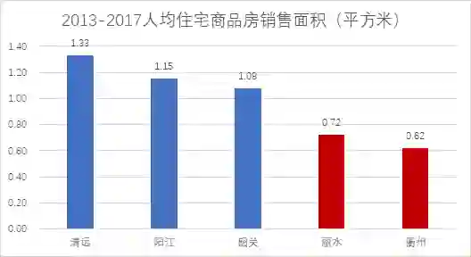 根据智谷趋势的统计,2013年-2017年衢州、丽水人均住宅商品房销售面积分别只有0.62平方米和0.72平方米,比起GDP同体量的广东清远、阳江、韶关,明显要小很多。