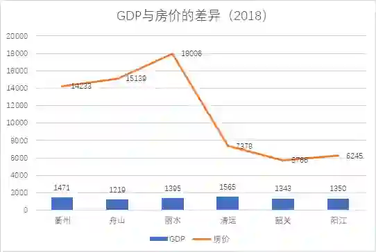 我们还是拿广东作为参考,这个省份有清远、韶关、阳江三个不太“争气”的小伙伴,经济体量都是一千多亿,跟衢州、丽水、舟山差不多。但是前者的均价区间只有5000-7000元,几乎是后者的三分之一。(见下图)