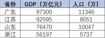 实际上,浙江省的GDP和人口实力长期落后于广东、江苏、山东,相当于广东的一半左右。