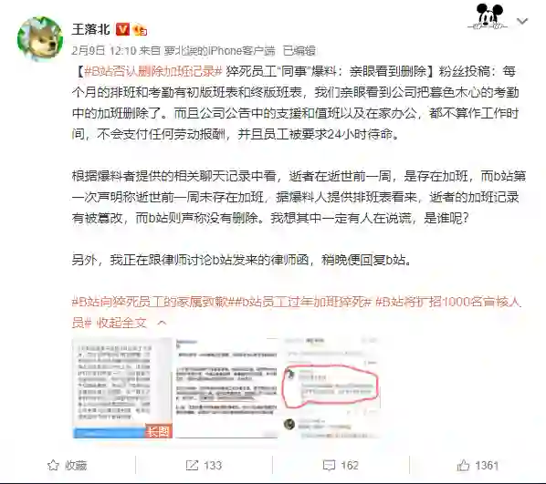 根据爆料者提供的聊天记录,逝者在去世前一周存在加班,但B站第一次声明中称其去世前一周并未加班。爆料人提供的排班表显示,逝者加班记录有被篡改情况,但B站声称没有篡改。此外,王落北还透露自己已收到B站委托的律师函,但其没有公开律师函具体内容。