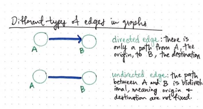 不同类型的边或路径对定义和识别图时非常重要。边的类型实际上是图之间最大、最明显的区别之一。大多数情况下(只有一种例外),图会有两种类型的边:即具有方向或流向的边和不具有方向或流动的边。我们将其称为有向边(directed edges)和无向边(undirected edges)。