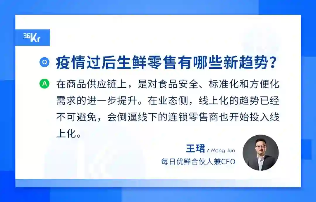 一方面线上生鲜零售被推进到两年后的状态,同时线下份额也开始往龙头商超渗透,生鲜零售行业会出现明显的跑出来第一梯队,有的是以线下龙头的商超加上线上化服务为主的;有的是我们这样纯线上的前置仓连锁企业。