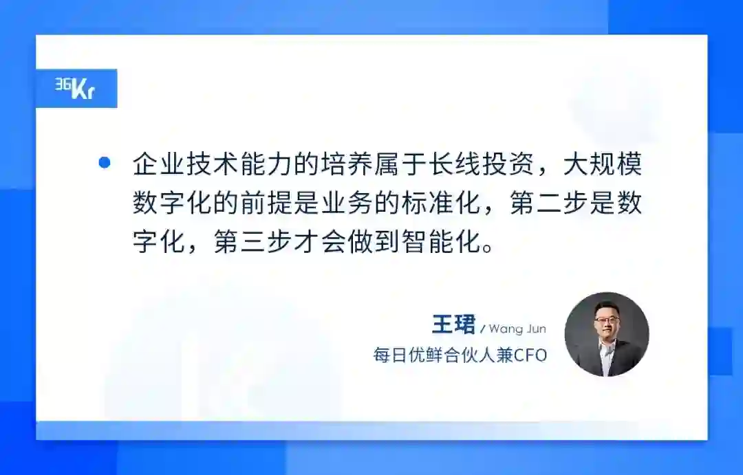 每日优鲜选择了后者,并且还要在供给侧、数字化这些核心能力上持续投入。据了解,每日优鲜搭建了超过500人的技术团队,每年会在技术上投入数亿元。王珺称,“技术第一年就是投入,还看不到水花儿,需要足够长的前置时间组建起来。如果想要构建一个500人以上的产业团队,至少要3-5年才有产能。”