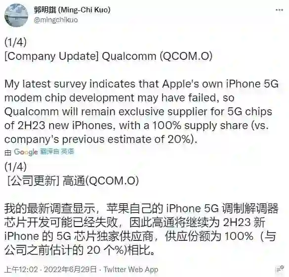 这也应验了分析师郭明錤几个月前的“剧透”。他表示,苹果的自研 iPhone 5G modem 芯片遭遇了失败,至少在 2023 年下半年的 iPhone 15 系列上,高通还将是 iPhone 独家的 5G 基带供应商。