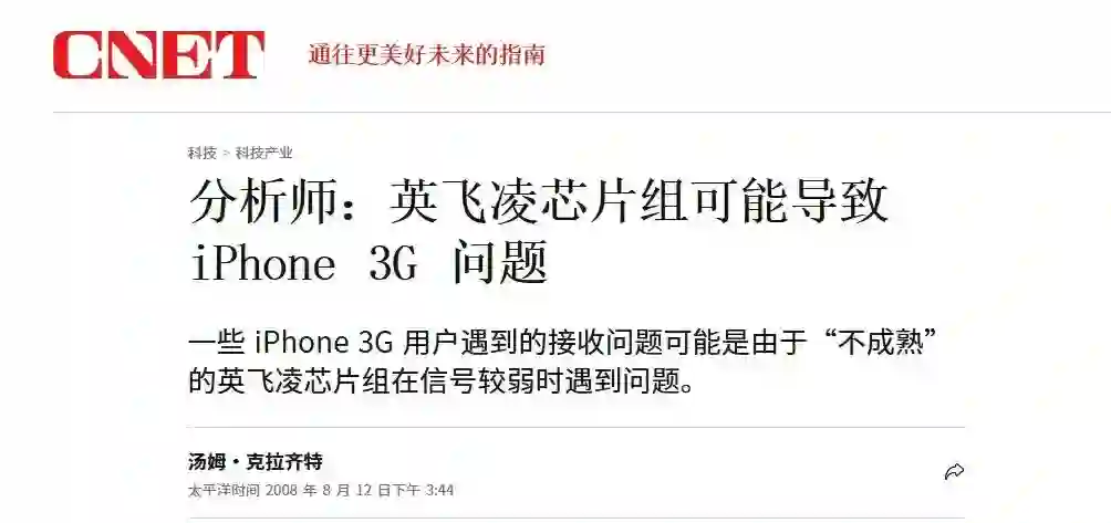 苹果自研 5G 芯片的班底,是 2019 年 7 月从英特尔收购来的,而英特尔的技术基础,又是 2010 年从英飞凌收购来的。英飞凌当时不过是全球排名第五的基带厂商,曾为 iPhone 3G 等苹果早期机型供应基带,还因为信号问题还曾受到质疑。