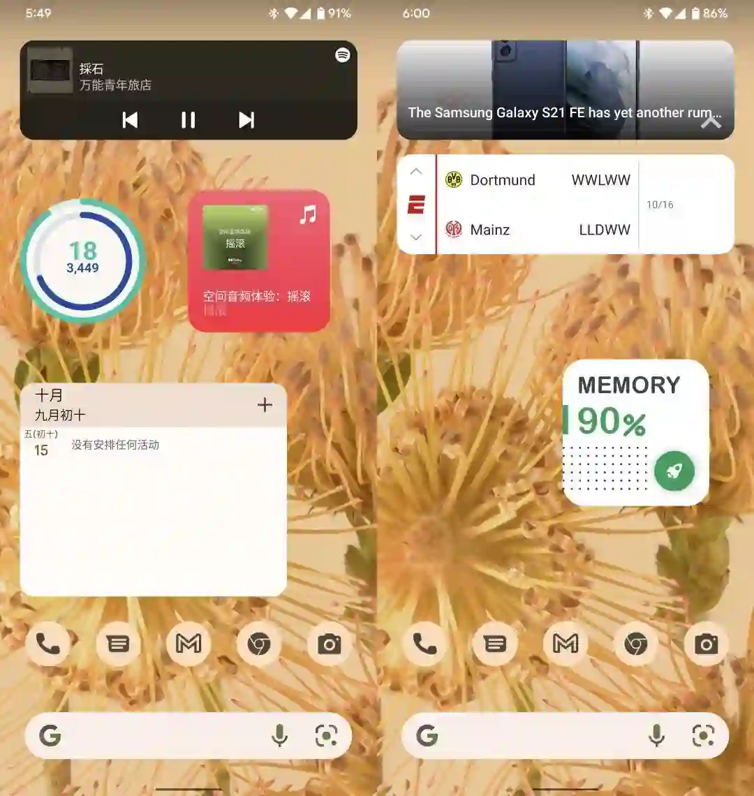 Android 12 的小组件现在全面适应圆角化,对于旧版的小组件,系统会自动将其裁剪为圆角。若是适配了 Android 12,小组件会自动为背景选取主题色,形形色色,均与 Android 12 的系统风格相协调。