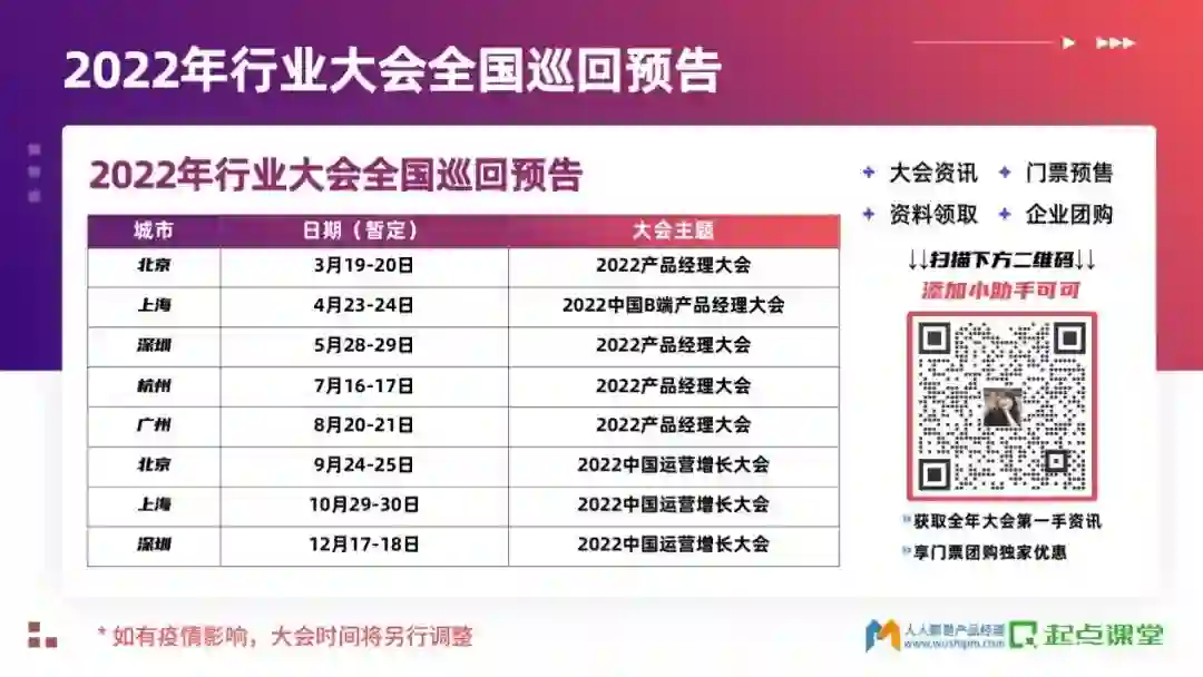 2021全年大会已结束,2022年的产品经理大会、运营增长大会正在筹备中!起点课堂高级会员可免费兑换全年大会现场门票!