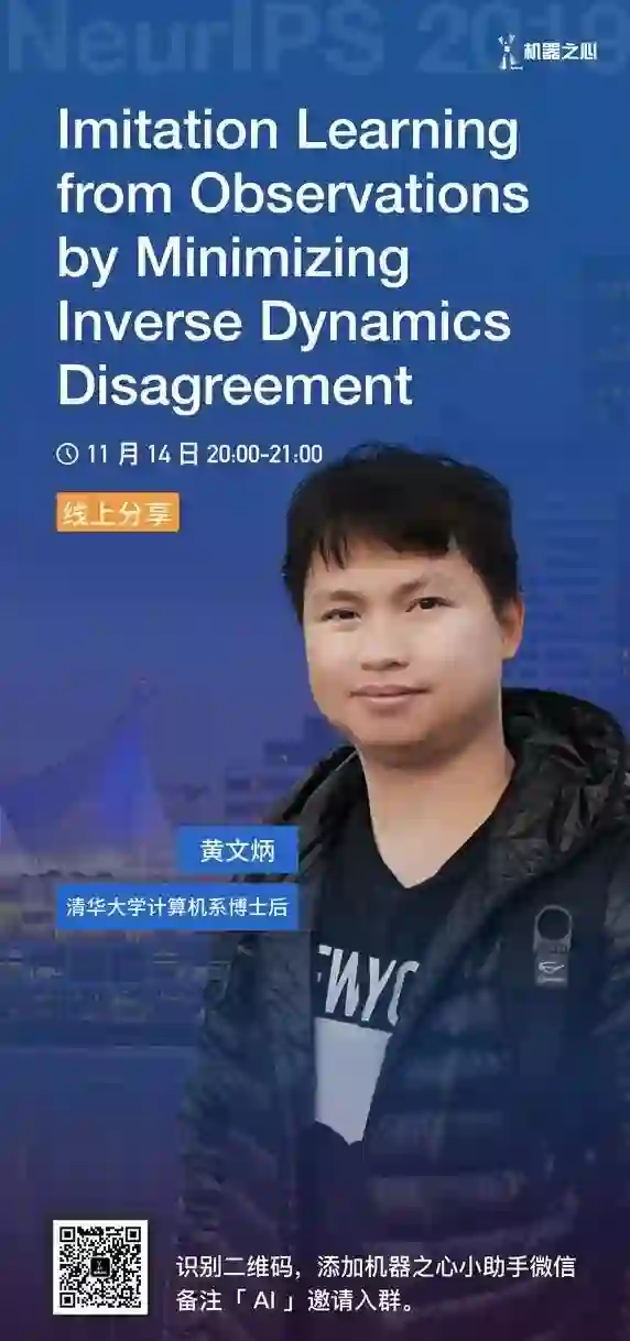 此次演讲将介绍清华大学、腾讯 AI Lab、MIT-IBM Watson AI Lab 合著的论文《Imitation Learning from Observations by Minimizing Inverse Dynamics Disagreement》,该文入选 NeurIPS-2019 Spotlight,主要探讨不完备专家演示 (缺少 action 演示) 下的模仿学习。