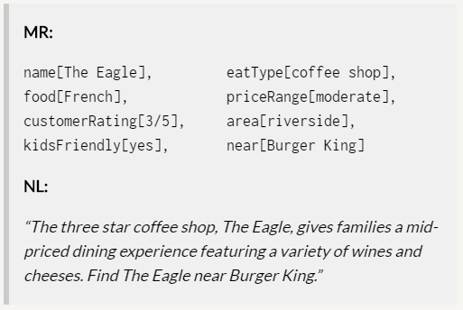 E2E NLG Challenge 链接:http://www.macs.hw.ac.uk/InteractionLab/E2E/