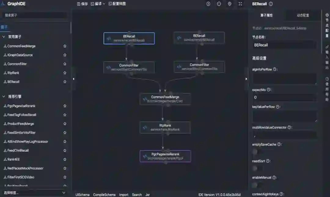 召回、预估、合并、打散、过滤等业务操作封装为业务算子,在业务算子中可以查询数据源,返回数据集后通过基础算子计算得到结果。最终业务图中执行单元为业务算子和数据源,业务图中通过对数据源和业务算子的依赖关系进行配置,表达业务逻辑。