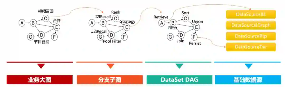 通过业务子图、基础数据集、基础数据源等层面的将业务进行分解,基础数据集API和通用数据源算子和业务无关,业务层通过使用基础API进行业务算子实现和依赖组成最后业务逻辑图。最终达到业务层、基础层的复用。
