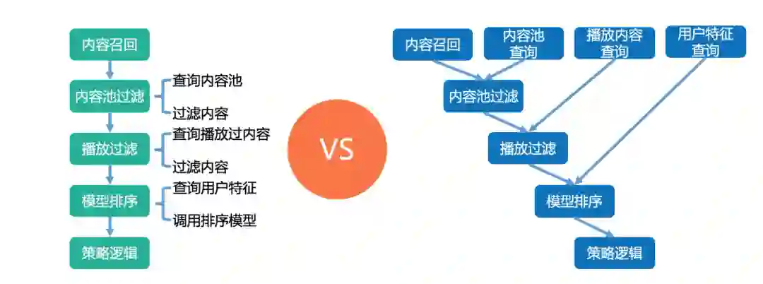 在图架构之前,模块的封装都以串行逻辑运行,其中会存在一些可并行优化的处理逻辑。比如在播放过滤和内容池过滤部分,内容池的查询和播放内容的查询本身是不相关,没有直接依赖,是可并行执行的操作。在串行编码情况,实际执行逻辑维持串行逻辑。