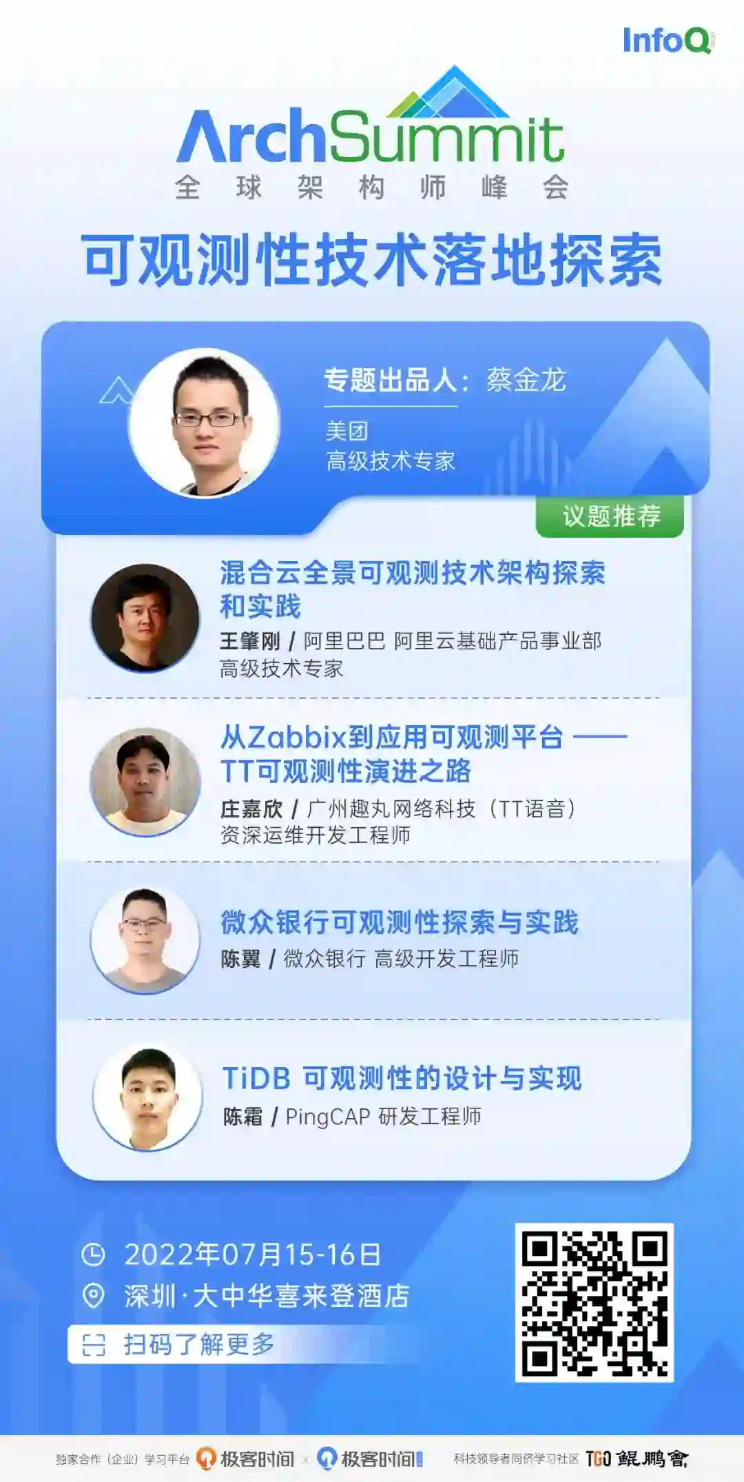 7 月 15-16 日 ArchSummit 全球架构师峰会将落地深圳,大会设置了「可观测性技术落地探索」专题,邀请到了阿里、PingCAP、微众银行、TT 语音等公司的嘉宾向大家分享可观测性技术落地的相关实践经验,点击阅读原文查看大会更多精彩内容。