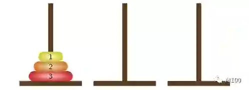 有些人可能还不知道汉诺塔问题:汉诺塔问题是在1883年发明的,由3根木棍和一系列大小不一的圆盘组成(比如上图中的3个)。从最左侧的木棍开始,目的是以最少的移动次数,把最左边的圆盘移动到最右边的圆盘上。