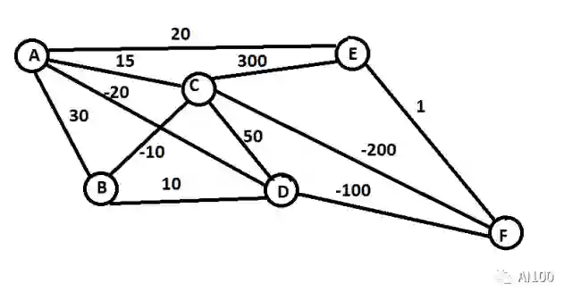 这个问题是一系列旅行商(TSP)问题的代表。任务是以尽可能低的成本从地点A到达地点F。两个字母之间的每条边上的数字表示两地之间的花费。如果这个值是负数,那么表示经过这条路,你会得到一定的报酬。这里我们定义的价值(Value)是运用选择的策略走完整个路程时,所获得的总价值。