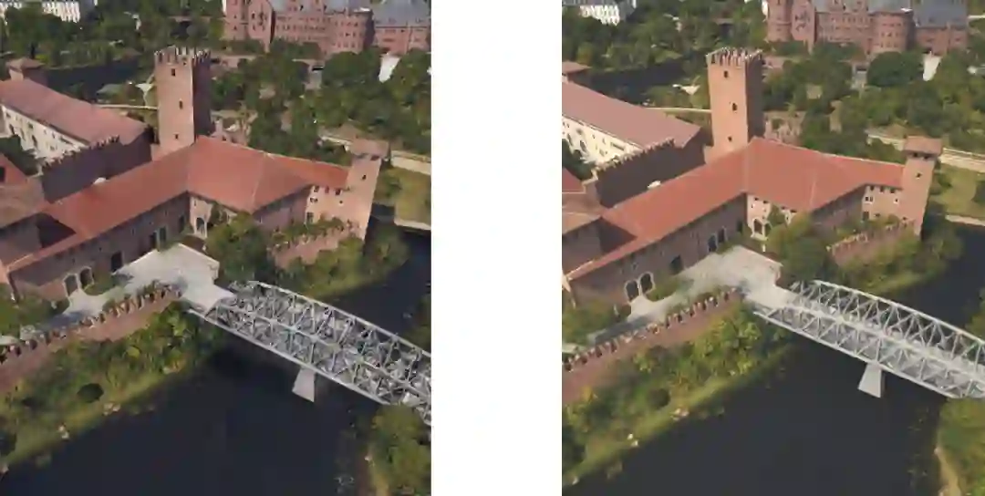 对比传统几何重建(左),辐射场能够更好的恢复精细的桥梁结构(右)。
