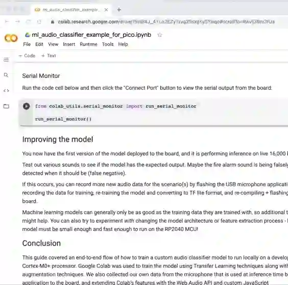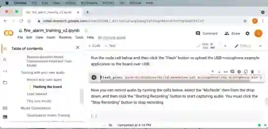 利用 Google Chrome 的网络音频 API、网络 USB API 和网络串行 API 功能来扩展 Google Colab 的特征,与开发板进行互动。这样我们就能够完全通过网络浏览器对我们的应用进行实验和开发,并将其部署到一个受限的开发板上进行设备端推理。