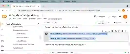 我们现在可以用 Google Colab 录制火灾警报的声音,在下拉菜单中选择“MicNode”,将其作为音频输入源。然后在按下烟雾报警器的测试按钮时,点击 Google Colab 上的录音按钮,录制一个 1 秒钟的音频片段。将此过程重复几次。