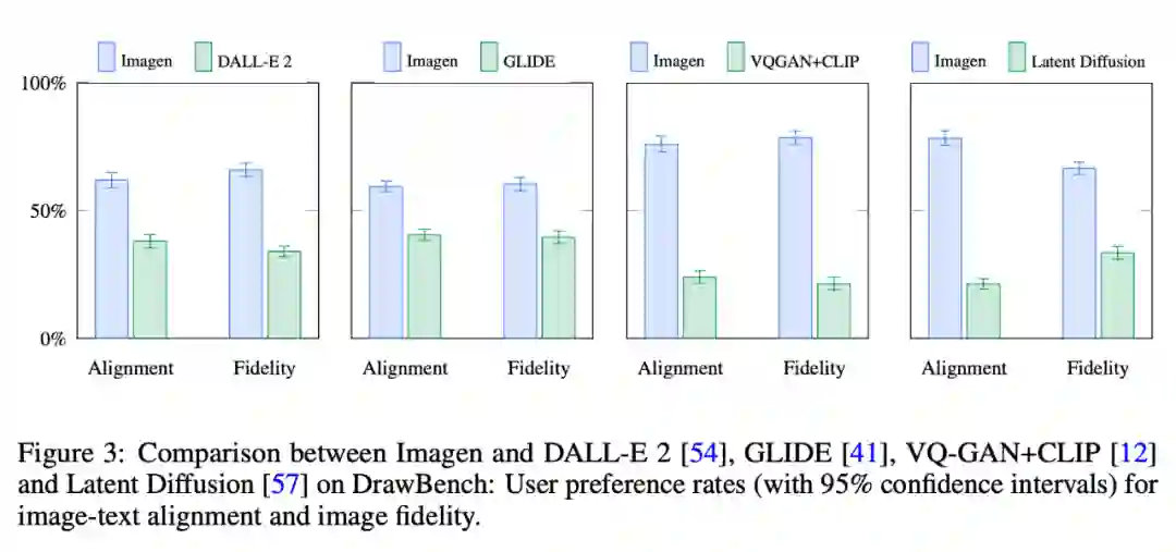 图 3 展示了三个模型中每一个模型对 Imagen 成对比较的人类评估结果,包括偏好模型 A、模型 B,或者不受图像保真度和图像文本对齐影响。可以看出,在图文对齐和图像保真度方面,人类评估者极其偏爱 Imagen 模型。读者可以参考附录 E,了解更详细的类别对比和定性对比。