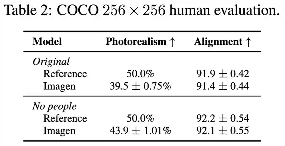 表 2 展示了在 COCO 验证集上测试图像质量和对齐的人工评估结果,包括原始 COCO 验证集和过滤后的版本。在这个版本中,所有与人相关的参考数据都被删除了。在没有人的设置下,Imagen 的偏好率提高到了 43.6% ,这表明 Imagen 生成逼真人物的能力有限。在标题相似度方面,Imagen 的得分与原始的参考图片相当,这表明 Imagen 有能力生成与 COCO 标题相一致的图片。
