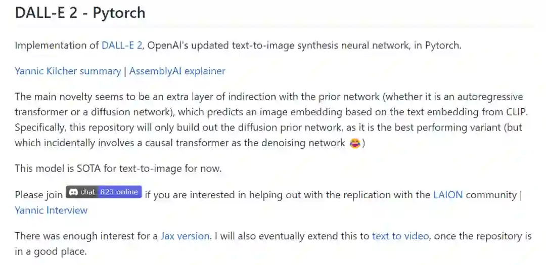 不过,和前段时间大火的 DALL・E 2 一样,我们很难指望谷歌将这个模型开源。对此,有网友建议说,可以去 GitHub 上找一些「野生」复现来玩一玩,比如已经放出一段时间的「DALL-E 2-Pytorch」项目: