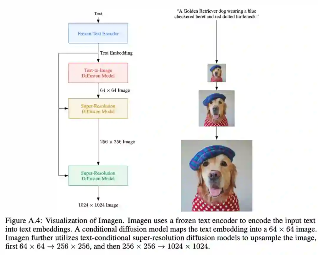 Imagen 由一个文本编码器和一系列条件扩散模型组成,前者将文本映射为一系列嵌入,后者将这些嵌入映射为分辨率不断提高的图像,如图 Fig. A.4 所示。