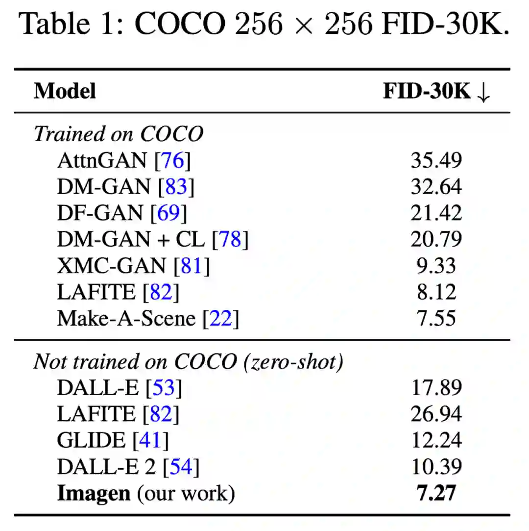 Imagen 以 7.27 的得分在 COCO 上实现了 zero-shot FID 的 SOTA 结果,超越了 DALL-E 2 及其他同期工作,甚至超过了其他在 COCO 上训练的模型。