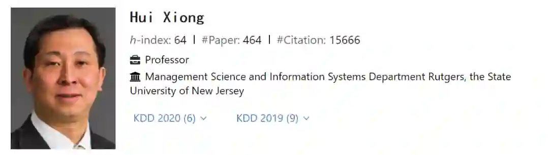 Hui Xiong(熊辉)博士以 6 篇论文入选本次会议也并列位于华人投稿榜第 2,值得一提的是他去年以 9 篇论文入选位居华人投稿榜第一,且他也是近 5 年中最高产的学者!