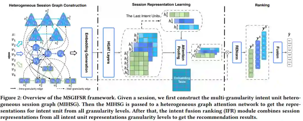 本文针对会话推荐方向,相较于关注序列中的单个商品,本文关注如何利用GNN从连续片段中捕获用户偏好。通过多粒度连续用户意图单元捕获用户兴趣,作者提出了多粒度意图异构会话图(MIHSG),它捕获了不同粒度意图单元之间的交互并减轻了长依赖的负担。此外,作者提出了意图融合排名(IFR)模块来组合来自各种粒度用户意图的推荐结果。
