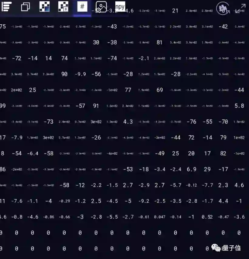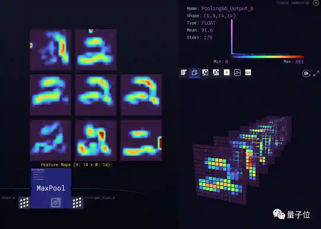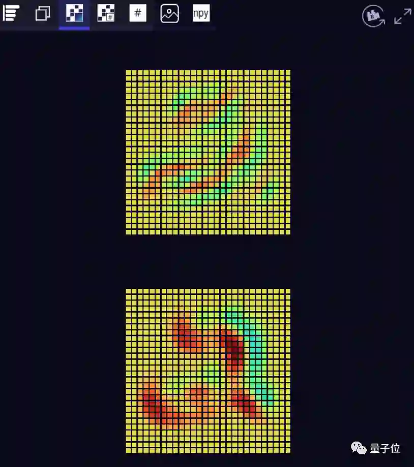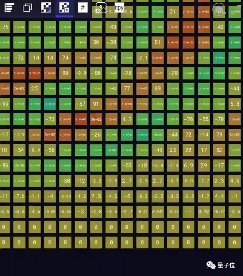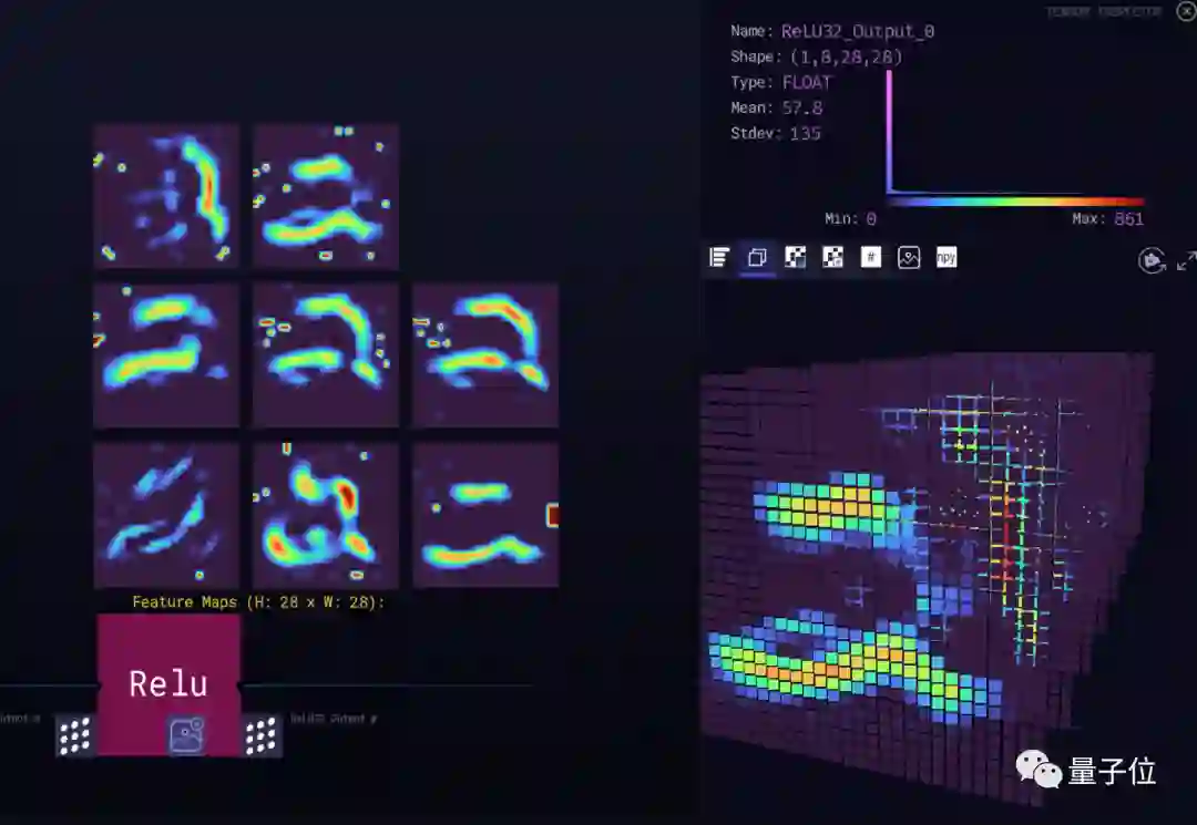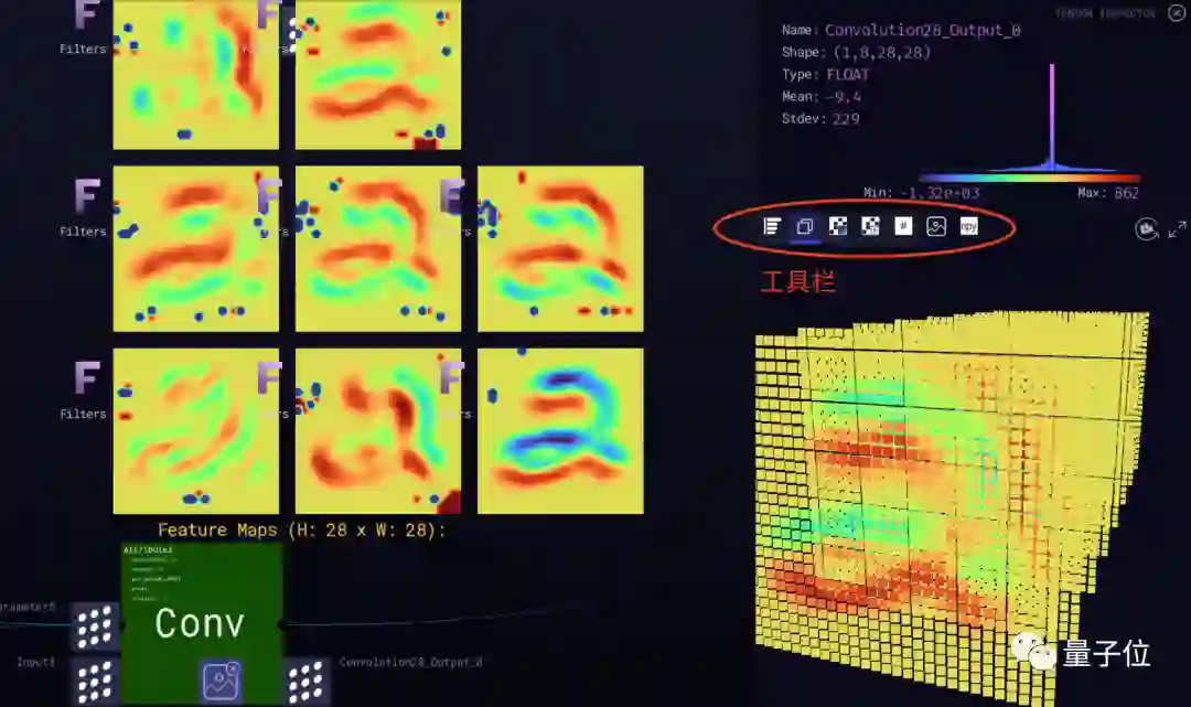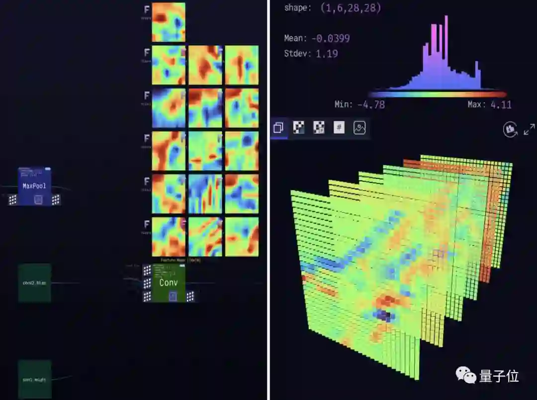 点击它,Zetane Engine会在界面右边展示出一个工具栏,把刚才显示在卷积层上面的图片呈现出各种各样的形式~