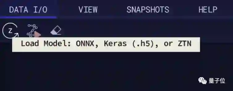 上传模型的按钮在启动台左上角Z字标志这里,Zetane Engine支持ONNX、Keras(.h5)以及ZTN三种模型文件。