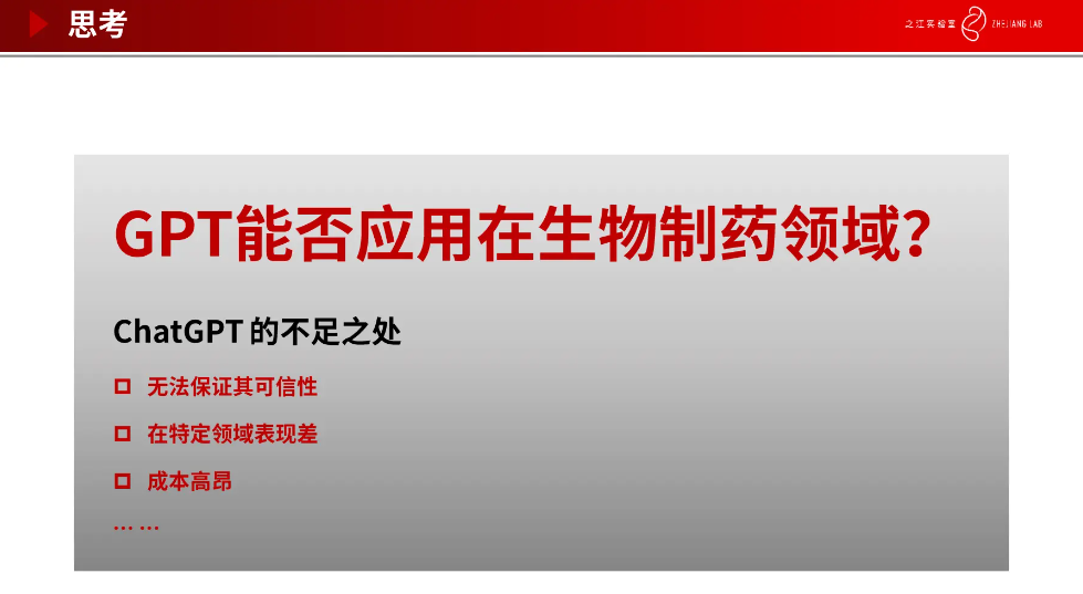 目前有很多国内外企业正在部署大模型,包括百度、微软、谷歌等,其大部分研究领域都在智能搜索,智能问答等方向,并没有布局到智能制药方向。GPT 能否应用在生物制药领域,或者直接搬过来行不行?当我们把 ChatGPT 直接应用到专业领域时还存在很多不足。一是无法保证其可信性,例如分子生成任务,需要通过引入领域知识、结合强化学习和湿实验等来验证生成分子的有效性。其次,由于训练过程使用的通用数据缺少领域知识,造成 ChatGPT 在特定领域表现并不好。另外,模型的训练部署以及相关湿实验的成本都非常高昂,这也是药物研发里流程长、投入大的原因之一。