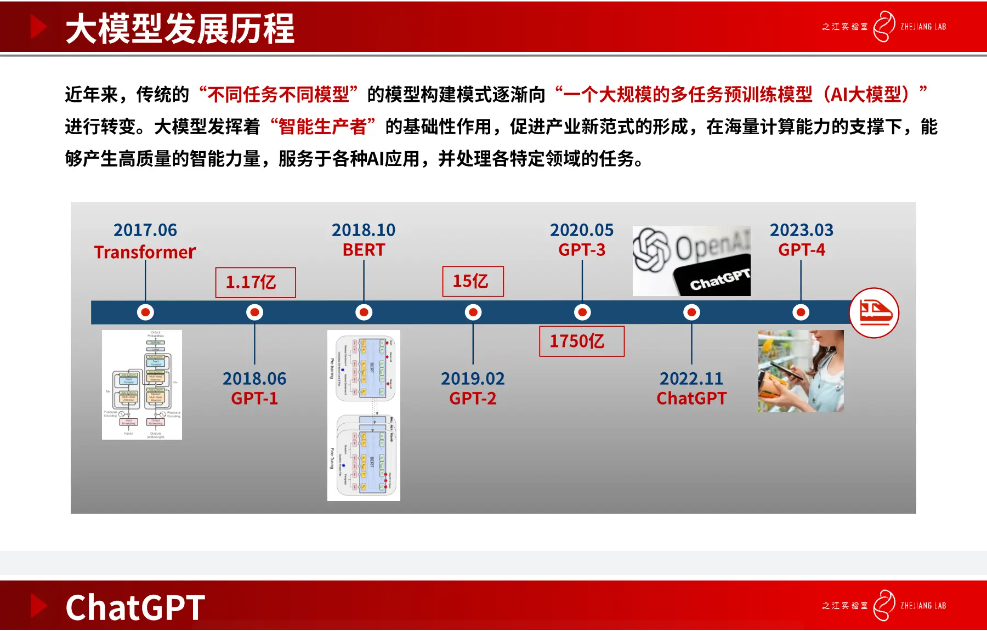 近年来,模型构建范式逐渐从「针对特定任务构建特定模型」转向「可用于多任务的大规模预训练模型」。大模型的发展历程有几个阶段, 从 2017 年的 Transformer 到 GPT-3、ChatGPT,再到包括 GPT-4 在内的面向多模态的预训练模型,这其中模型参数量和数据量都呈现出爆发式的上升趋势。在海量计算能力的支撑下,大模型能更好的应用于更多复杂场景。