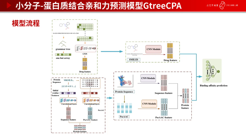 最后,我们还需要判断生成分子与靶标结合的效果如何,这也是非常关键的一环。可以通过使用亲和力预测模型来验证生成分子的有效性,亲和力越高说明生成分子与靶标结合效果越好,药物越有效。下图是模型架构。我们也在数据集上做了测试,得出的效果也都非常好。