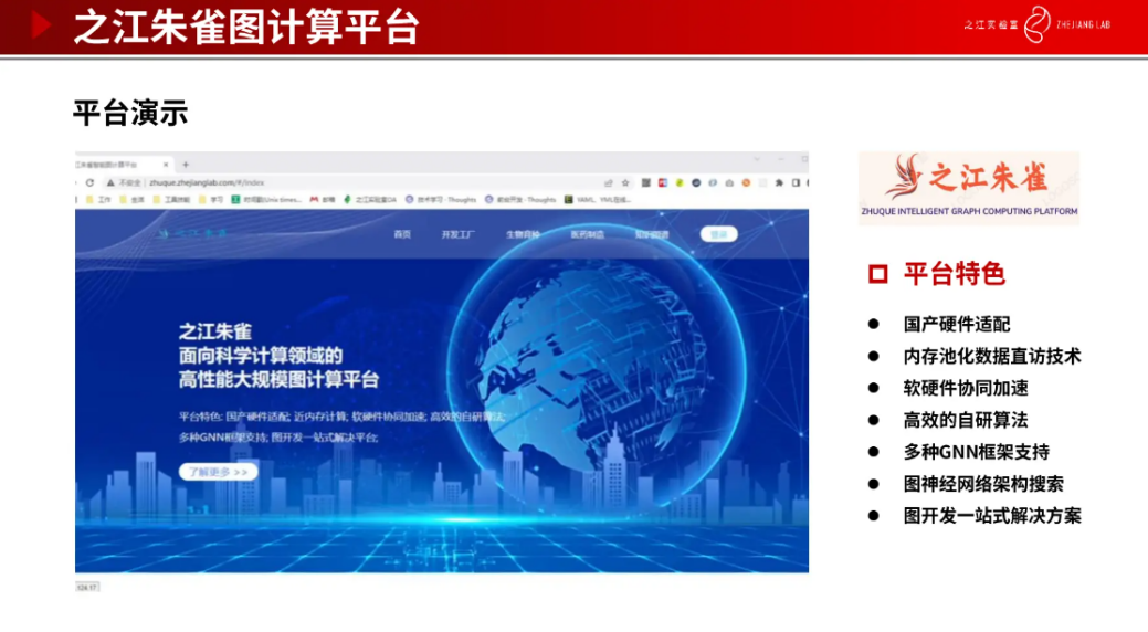 这是我们团队研发的朱雀图计算平台,集成了很多传统的图深度学习方法,包括利用分布式的存储策略等。也做了很好的国产硬件适配,包括华为的昇腾和鲲鹏。在平台上面我们可以做很多下游的任务,包括分子的生成等。其中也集成了我们自研的一些图学习算法,例如去年登榜 OGB 的孪生图神经网络 PSG 算法,通过多次中继路径采样生成多条中继路径感知的药物间最短反应路径距离的边特征张量,融合孪生图神经网络进行图表示学习和图对比学习,最终在药物-药物反应关系任务上获得 92.84% 的预测准确度,相比原冠军模型提升 2%,大幅提升了算法稳定性。比如得了新冠后,同时服用多种药物可能会产生副作用,利用我们研发的 PSG 算法就能很好的给出药物服用的建议,避免产生多种药物间的副作用。