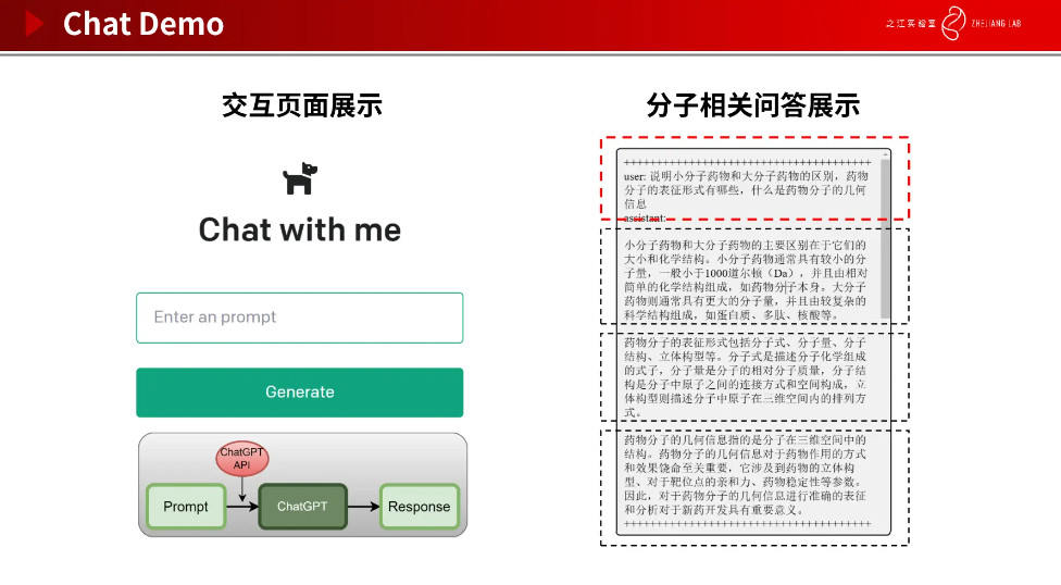 我们尝试对 ChatGPT 官网提供的 API 进行接入,制作了一个 Demo,让其解答分子相关问题。问题包括说明小分子药物和大分子药物的区别,药物分子的表征形式有哪些,什么是药物分子的几何信息等。这些都是非常专业的问题,涉及到药物领域的专业知识,ChatGPT 都给出了非常专业的答案(如下图所示)。