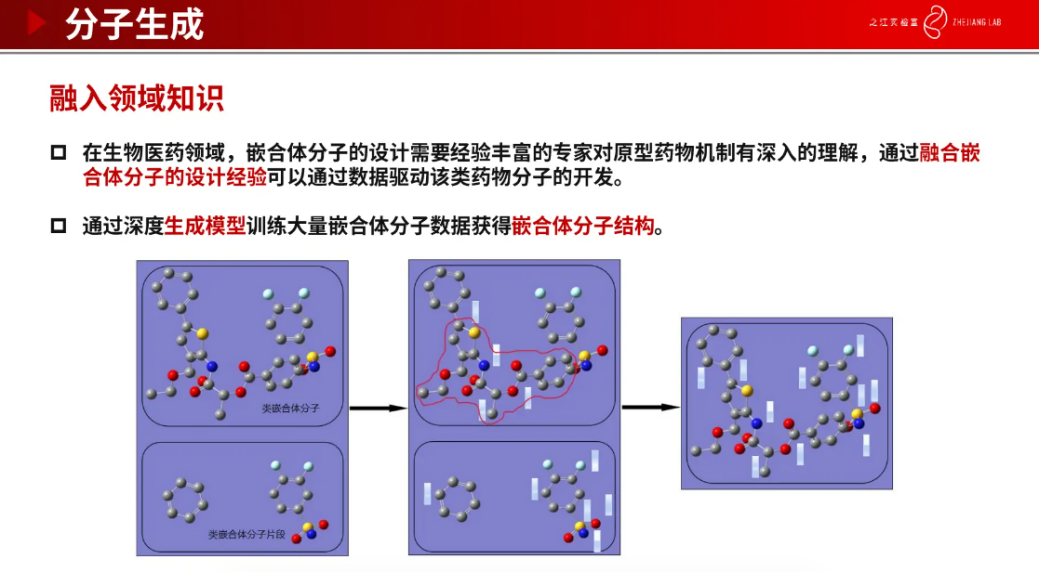 在药物分子生成之前,需要做靶点口袋结构的预测,涉及原子坐标的生成和转化。有了蛋白质口袋的预测结果后,我们要开始进行契合口袋的药物分子生成。我们团队正在开展分子生成相关的研究,其中包括基于扩散模型(Difussion)和融入领域知识等分子生成算法。我们首先介绍基于 Difussion 的分子生成算法,训练数据是原子特征和三维坐标信息,刚开始是是由随机噪声生成的初始分子图,这时候的分子并没有实际的生物意义,经过迭代一步步去除噪声,不断生成与真实分子非常接近的小分子。接下来介绍融合了领域知识的分子生成方法。传统方法需要经验丰富的专家通过对原型药物机制有深入的理解之后,融合嵌合体分子设计经验,才能生成这样的嵌合分子结构。现在有了我们这样的模型之后,可以通过深度生成模型训练大量嵌合体分子数据获得嵌合体分子结构。通过我们算法生成的分子和参考分子相差非常小,说明算法的有效性非常好。