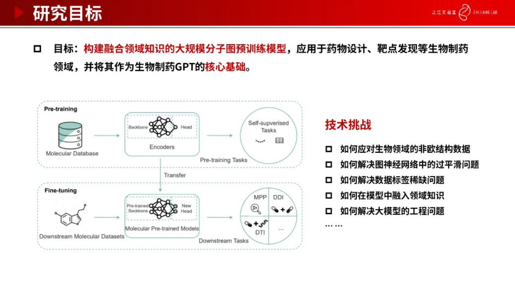 整个流程沿袭了大模型的思路。现有的一些大规模语言模型,如 Bert 和 ChatGPT 等,已在自然语言领域展现出了惊人的效果,但将其直接应用到生物制药领域将会面临一些新的挑战,比如,如何应对生物领域的非欧结构数据,如何解决图神经网络中的过平滑问题,如何解决数据标签稀缺问题,如何在模型中融入领域知识,如何解决大模型的工程问题。
