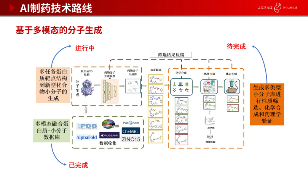 在药物发现过程中,分子生成是非常重要的一环。我们收集了大量的数据集,从而构建多模态融合蛋白质-小分子数据库。基于数据预测蛋白质 3D 结构,再通过药物分子生成模型,生成我们所需要的分子构成药物分子生成库,并对其进行初步筛选得到我们认为真正有用的药物分子。最后还需要通过湿实验对筛选分子进行验证,包括化学合成、体内实验和体外实验。找到真正有药效的小分子是非常困难的,也是非常复杂的。我们通过研发这样的模型,可以在短时间内生成大量的分子供药物学家进行筛选,加快筛选到有效的小分子。
