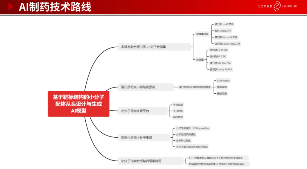 下图是基于靶标结构的小分子配体从头设计与生成 AI 模型的流程,包括构建多模态融合蛋白质-小分子数据集,蛋白质靶点结构预测、小分子药物发现平台设计、新型化合物小分子生成及小分子化学合成与药理学验证。