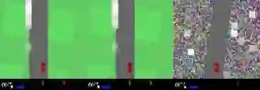 AttentionAgent 无法泛化到经过大幅修改的环境。左侧:背景突然变成一只猫(Creative Commons 视频 1)。中间:背景突然变成街机游戏(Creative Commons 视频 2)。右侧:AttentionAgent 学会了通过避开噪声区块在纯噪声背景下行驶