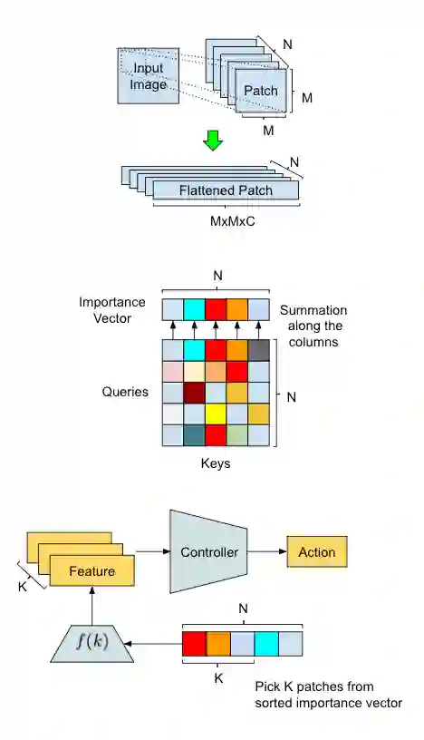 为了实现这一点,我们将输入图像分割成几个区块,然后依靠修改后的自注意力架构来模拟区块之间的投票,从而选出一个被认为重要的子集。在每个时间步中选择相关的区块,并且一旦确定,AttentionAgent 便仅基于这些区块进行决策,而忽略其余区块。