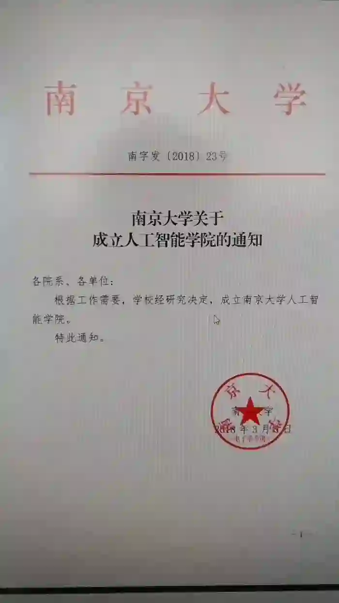 南京大学南字发【2018】23号文件显示,根据工作需要,学校经研究决定,成立南京大学人工智能学院。