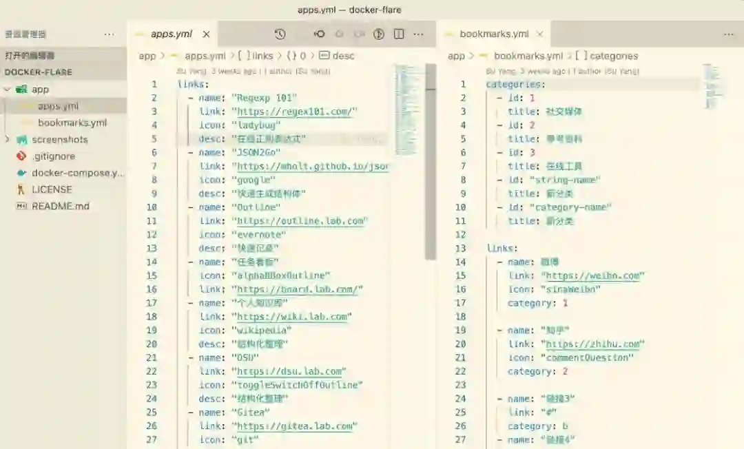 「书签」模块的配置(bookmarks.yml)类似,区别在于多了链接分类,在开头的 categories: 下配置:
