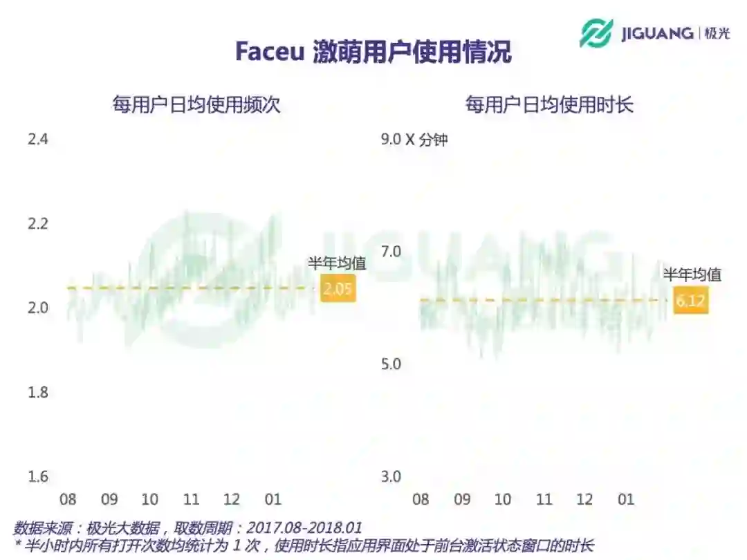 伴随着“激萌传送门”以及“遇见萌友”等社交功能的加入,Faceu激萌对于自身的定位也从单纯的拍照P图类工具转变为短视频社交平台。极光大数据的统计结果显示,过去半年中每名用户平均每天会打开Faceu激萌2.05次,每天的使用时长为6.12分钟。