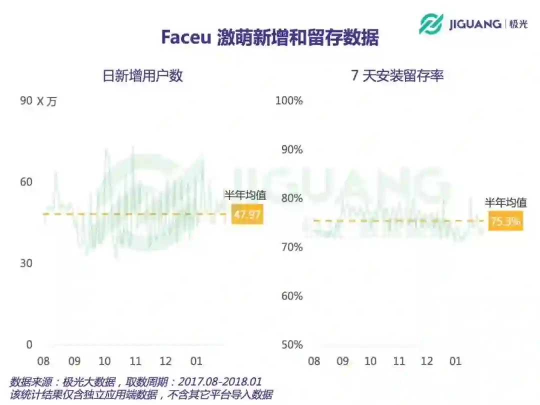 在日新增用户数上,Faceu激萌并未表现出明显的上升或下降趋势,其日新增用户数半年均值为47.97万。与此同时,Faceu激萌的7天安装留存率半年均值为75.3%。