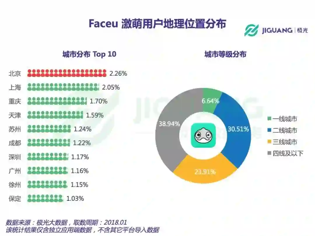 Faceu激萌的用户在一线城市的集中程度算不上显著。用户地理位置分布结果显示,分布在北上广深四个一线城市的Faceu激萌用户仅占6.64%,三线及以下城市的占比达到62.85%。在具体城市分布上,用户占比最高分别为北京、上海和重庆。
